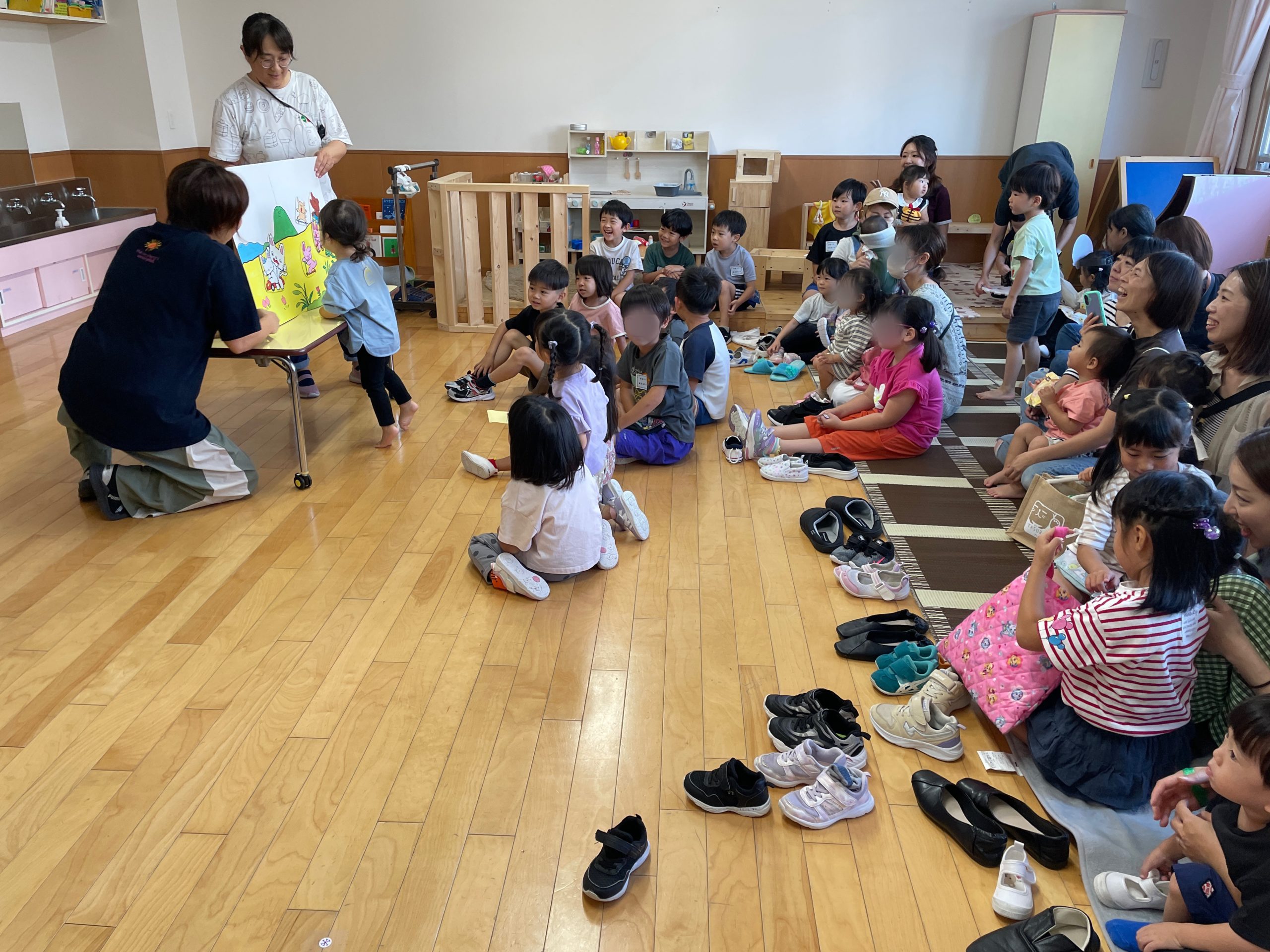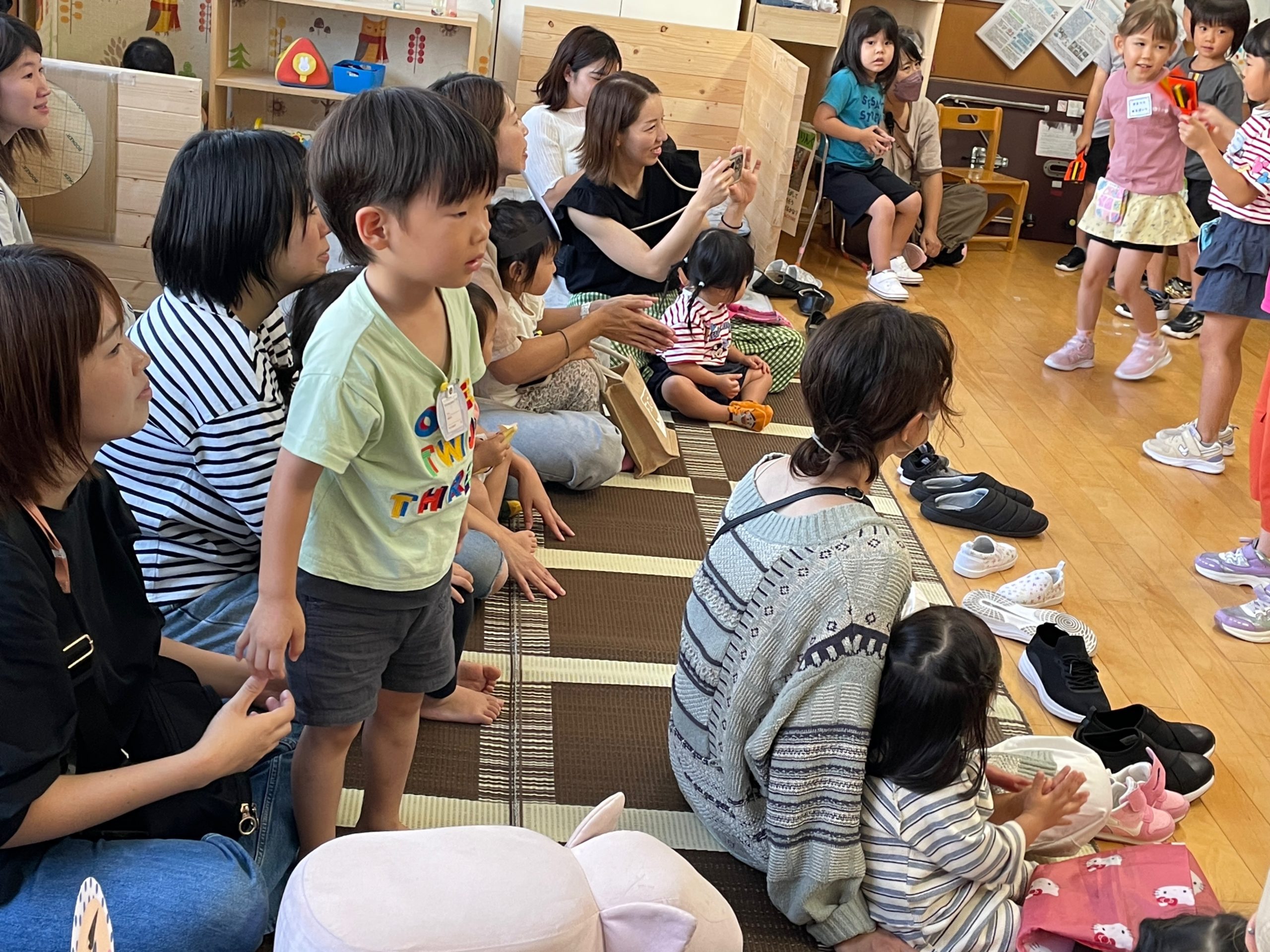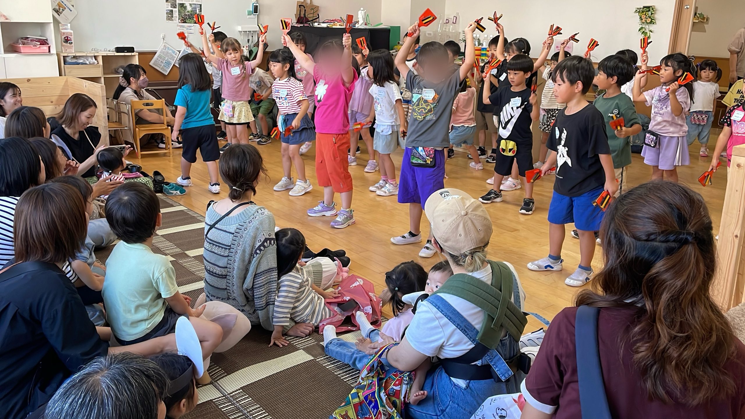おまつりごっこが終わった後は、年長さんによる「よさこい」と「にじ」の歌を未就園児さんにプレゼント🎁